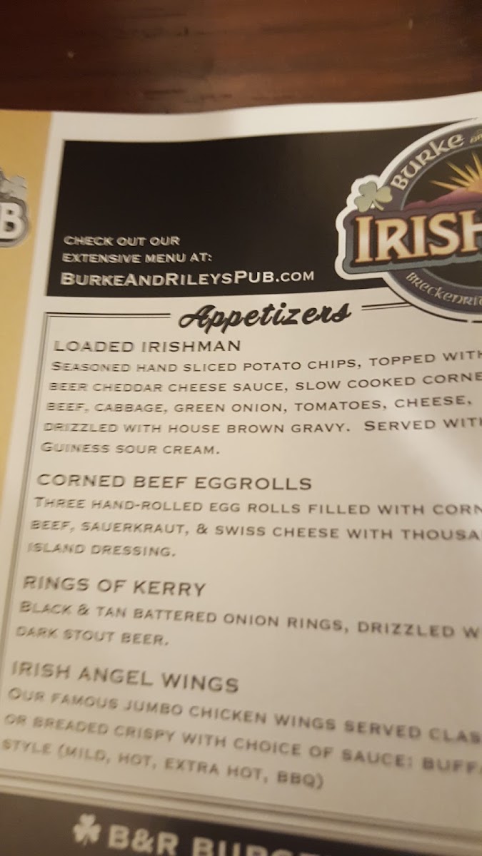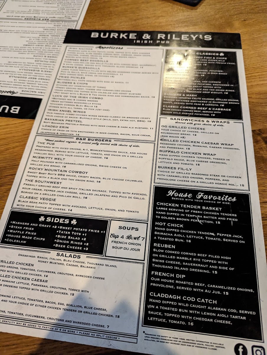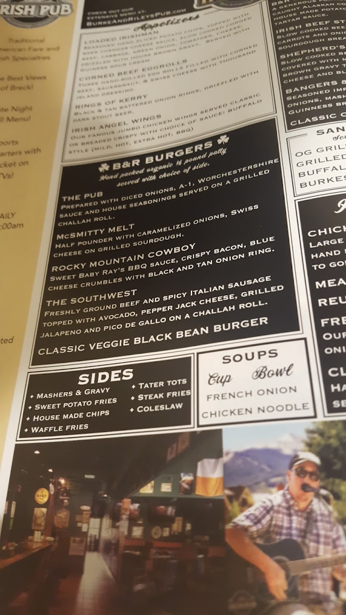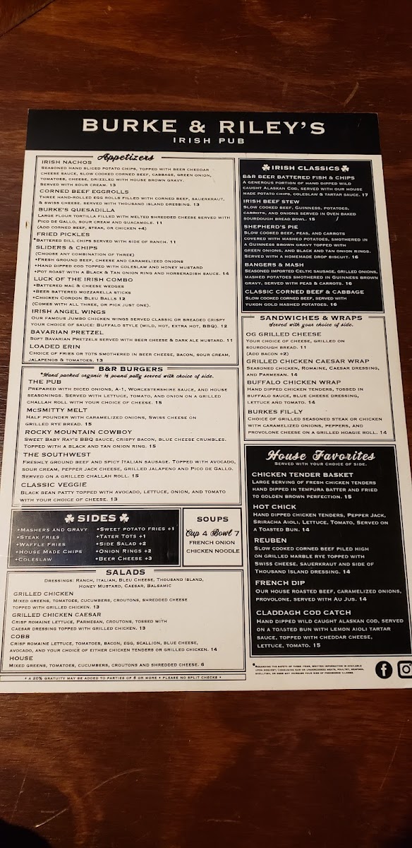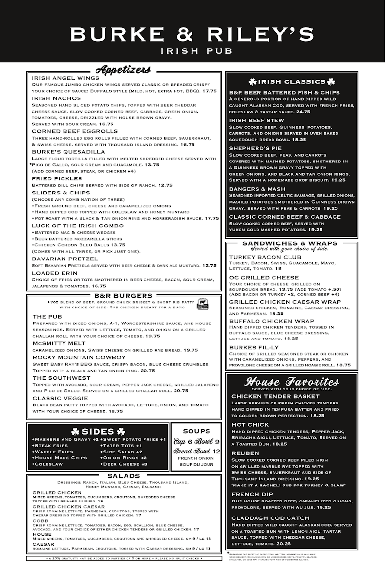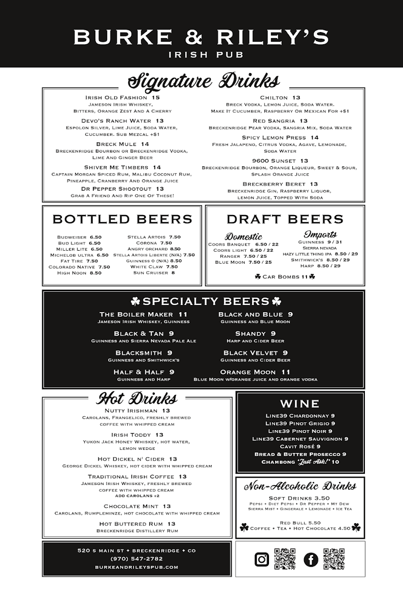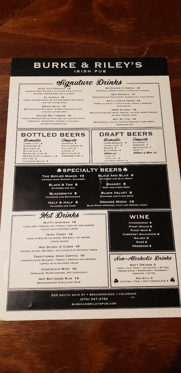 When you step into Burke And Riley's Irish Pub, you're in for a delightful treat. Nestled at 520 S Main St #3P in Breckenridge, CO, this cozy spot is perfect for anyone craving authentic Irish flavors with a modern twist. The menu offers a little something for everyone, whether you’re in the mood for hearty pub classics or something a bit more adventurous. From rich, flavorful stews to perfectly cooked fish and chips, every dish is crafted to make you feel right at home. Don't forget to check out their famous Irish whiskey selection or enjoy a pint of Guinness while savoring the lively, welcoming atmosphere. Whether you’re stopping by for a casual bite or celebrating with friends, the Burke And Riley's Irish Pub Menu is sure to leave you satisfied.
